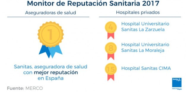 Sanitas se sitúa por cuarto año consecutivo como la aseguradora de salud con mejor reputación de nuestro país según el Monitor de Reputación Sanitaria (MRS) 2017 elaborado por MERCO. La primera parte del informe, que evalúa a los hospitales privados con mejore reputación, incluye a los Hospitales Universitarios Sanitas La Zarzuela y Sanitas La Moraleja y al Hospital Sanitas CIMA entre los 15 hospitales privados con mejor reputación en España, en cuarta, octava y decimoquinta posición respectivamente.